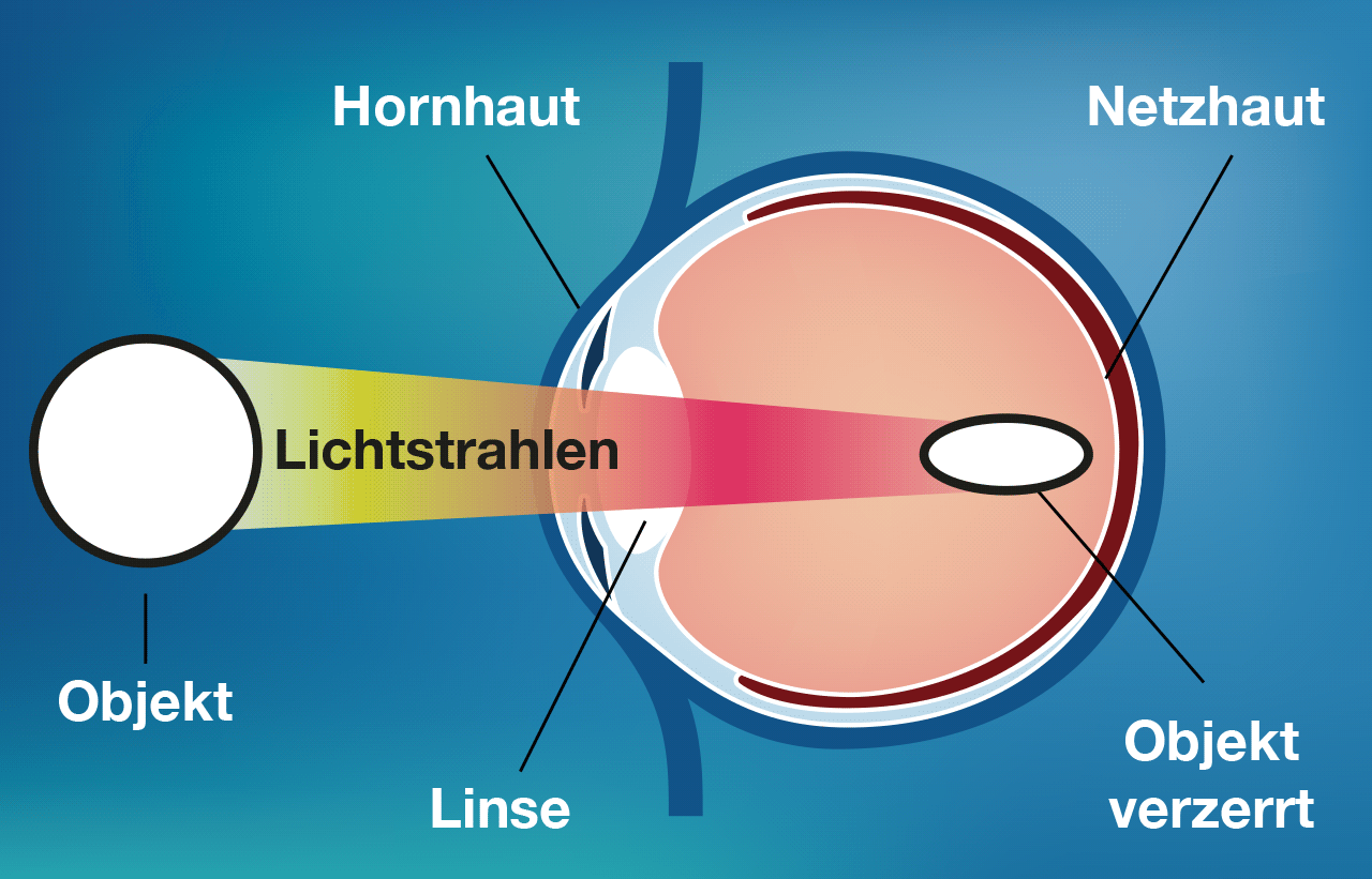 Die Hornhautverkrümmung entsteht durch eine ungleichmäßige Krümmung der Hornhautoberfläche und ist nicht wie beim normalen Auge halbkugelförmig. Die einfallenden Lichtstrahlen werden unterschiedlich gebrochen, treffen zerstreut auf die Netzhaut auf und liefern dadurch verzerrte Bilder. So wird beispielsweise ein rundes Objekt eiförmig dargestellt. Man spricht von Hornhautverkrümmung oder "Astigmatismus".