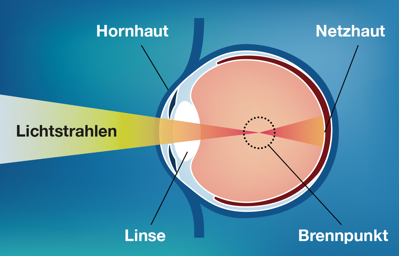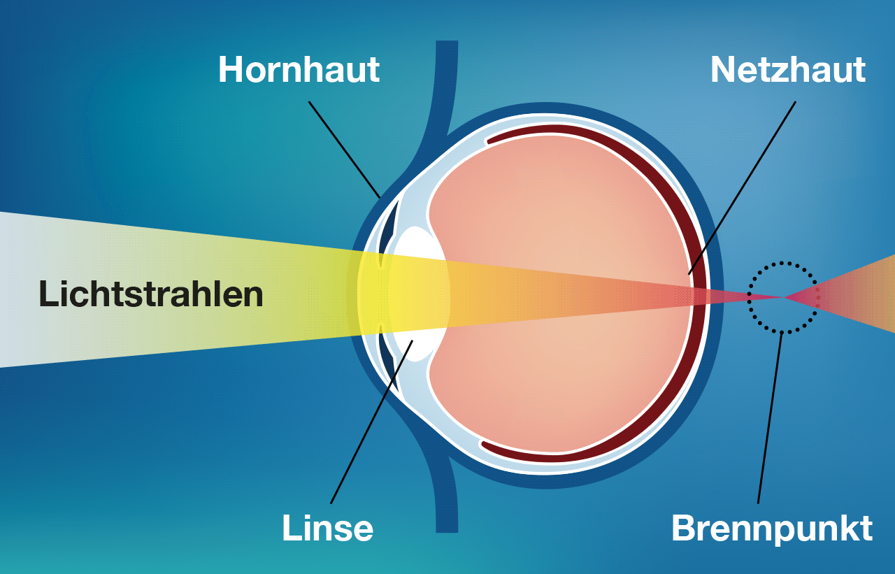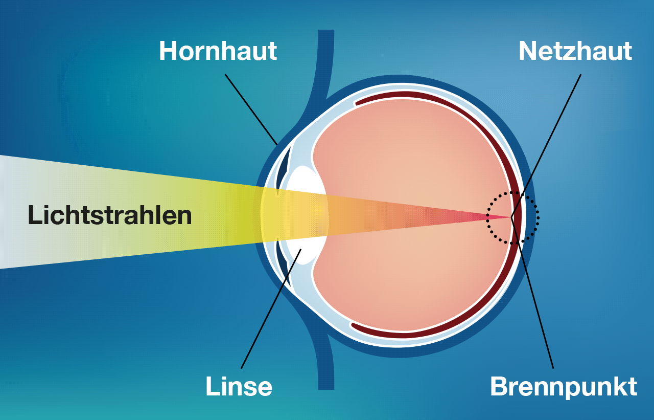 Ein scharfes Bild der Umwelt entsteht beim normalsichtigen Auge, wenn die durch die Hornhaut einfallenden Lichtstrahlen durch die Linse so gebrochen werden, dass der Brennpunkt exakt auf der Netzhaut liegt.