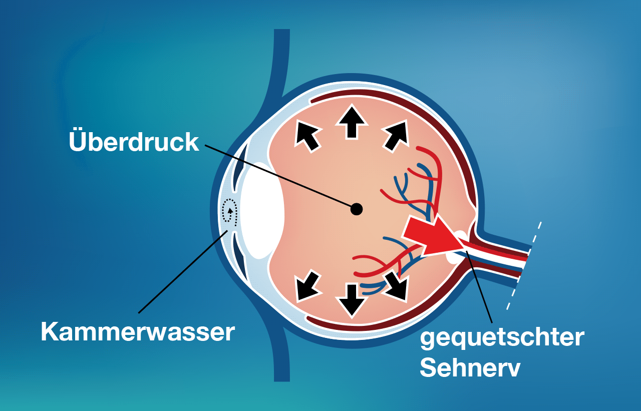 Die meisten Glaukomformen gehen mit einer Erhöhung des Augeninnendrucks einher, der entsteht, wenn zwischen Bildung und Abfluss des Augenkammerwassers ein Ungleichgewicht herrscht. Bei einem Druckanstieg ist die Blutversorgung des Sehnervs als Folge so beeinträchtigt, dass er nicht mehr ausreichend mit Nährstoffen versorgt und so stark und irreparabel geschädigt wird.
