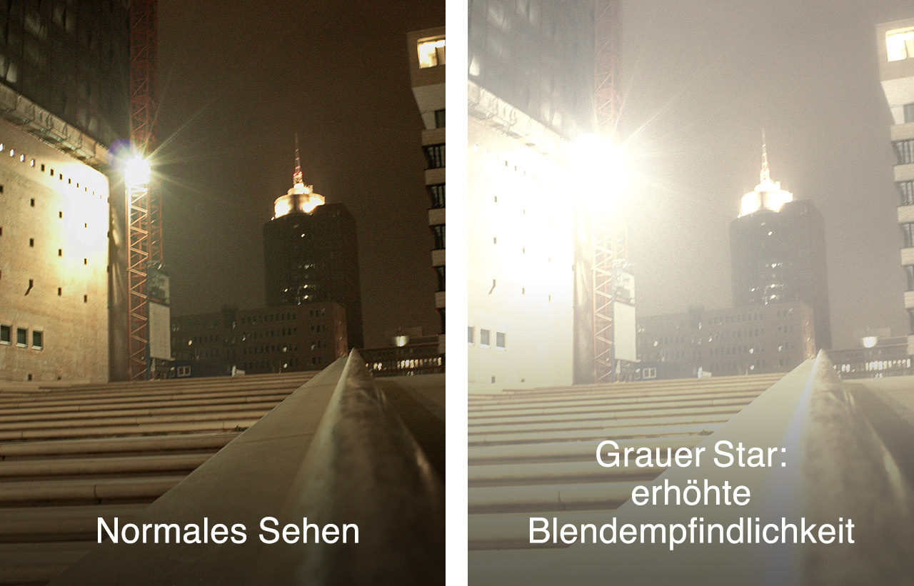 Ebenso geht mit dem Grauen Star fast immer eine zunehmende Blendempfindlichkeit einher: