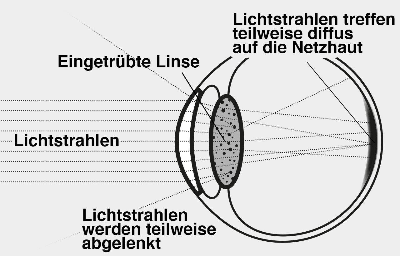 Durch den Grauen Star wird die Augenlinse zunehmend eingetrübt, so dass Lichtstrahlen immer häufiger abgelenkt werden und entweder diffus oder gar nicht mehr auf der Netzhaut auftreffen.