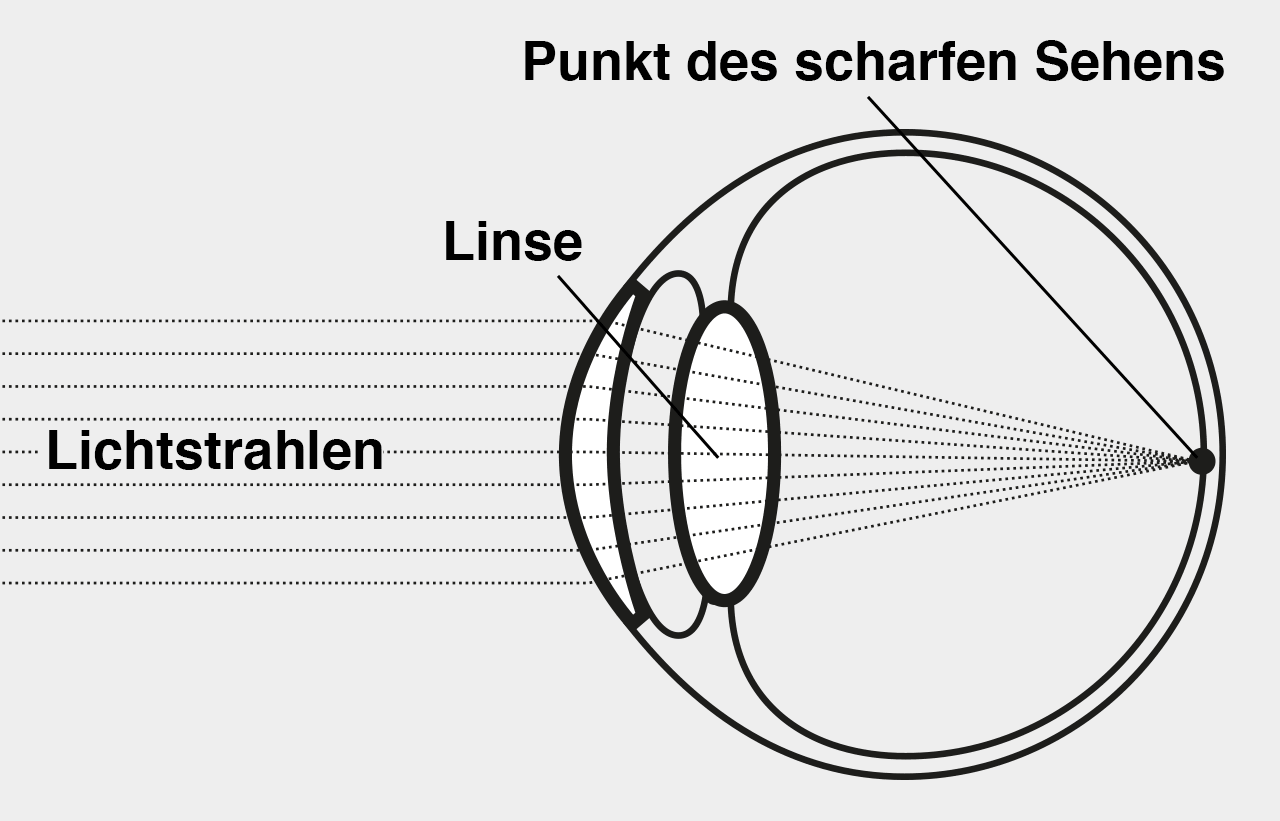 Beim gesunden Auge werden die einfallenden Lichtstrahlen von der klaren Augenlinse korrekt auf der Netzhaut abgebildet. Sie werden auf den Punkt des scharfen Sehens gebündelt.