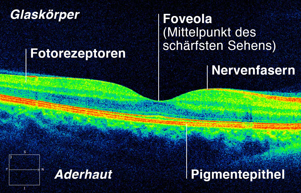 So ist insbesondere die OCT der Makula (zentraler Punkt der Netzhaut, siehe Abbildung) eine der wichtigsten Basisuntersuchungen in der Augenheilkunde geworden.